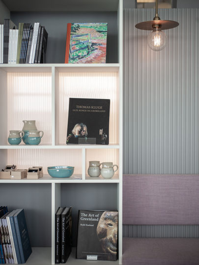 Med udsigt til fjorden står et specialdesignet bord med et indbygget lysbord, som understøtter det visuelle spil og skaber en dynamisk oplevelse, der balancerer mellem lys, gennemsigtighed og elegance. Det organiske formsprog guider bevægelsen i rummet og fremmer en følelse af ro, samtidig med at det inviterer til leg og aktivitet.
