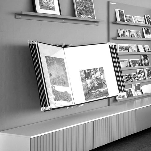 X1 er udviklet til butikker, gallerier og museer, hvor plads er afgørende. Den væghængte konstruktion frigør gulvareal, mens den skrå vinkel gør det naturligt at bladre plakaterne igennem som i en bog.